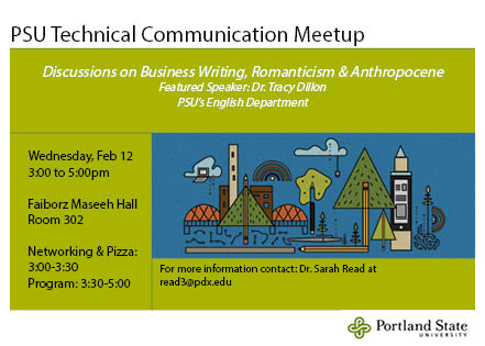 At the February PSU TC Meetup we have a special opportunity to meet Dr. Tracy Dillon, a long-time faculty member and former director of the PSU MTPW program. Many current and former students have taken online courses from Dr. Dillon, including in most recent years Document Design and Grant Writing. Since Dr. Dillon teaches primarily online, many students have not had the opportunity to meet Dr. Dillon in person–this is your chance! You can also ask him questions about his research interests in Romanticism and the Anthropocene.